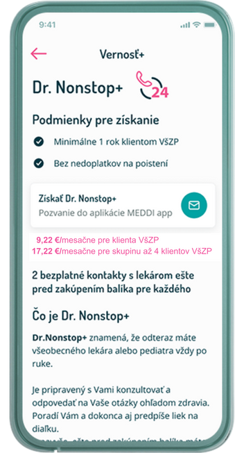 Ako verný klient si v mobilnej aplikácii VšZP vyberte Dr. Nonstop+, kliknite na Získať Dr. Nonstop+. Po kliknutí na Dr. Nonstop+ dostanete na váš e-mail informácie pre stiahnutie aplikácie MEDDI app. Po otvorení aplikácie kliknete na Dostal som pozvánku a zadáte 6-miestny kód z e-mailu. V rámci registrácie si môžete pridať aj ďalších poistencov, prípadne ich môžete pridať neskôr a uhradíte príslušný poplatok spoločnosti MEDDI hub.
