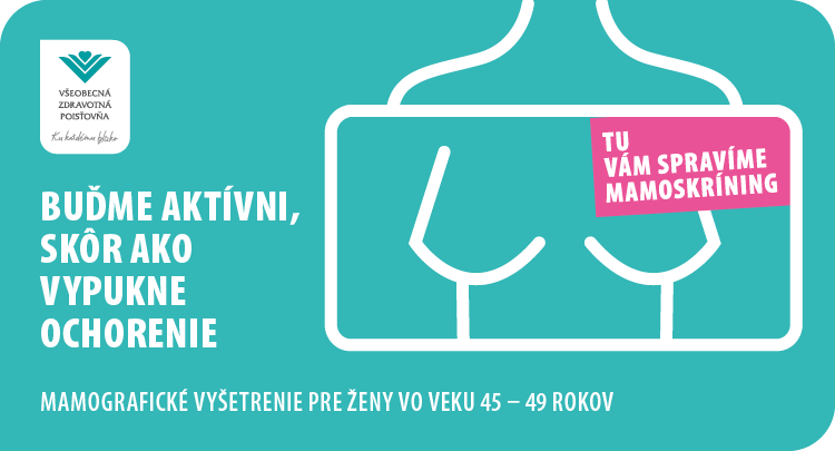 Od 1. apríla 2025 pozývame naše poistenky už vo veku od 45 do 49 rokov na bezplatné skríningové mamografické vyšetrenie prsníkov v certifikovanom (špecializovanom) mamografickom pracovisku. Hoci zákonná hranica na toto vyšetrenie je zatiaľ stanovená od 50 rokov veku ženy, my vo Všeobecnej zdravotnej poisťovni veríme, že prevencia nemá čakať – a preto túto možnosť ponúkame už skôr.