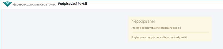 - V prípade kliknutia tlačidla Zrušiť je užívateľ presmerovaný späť do podpisového portálu a môže sa k podpisovaniu neskôr vrátiť.